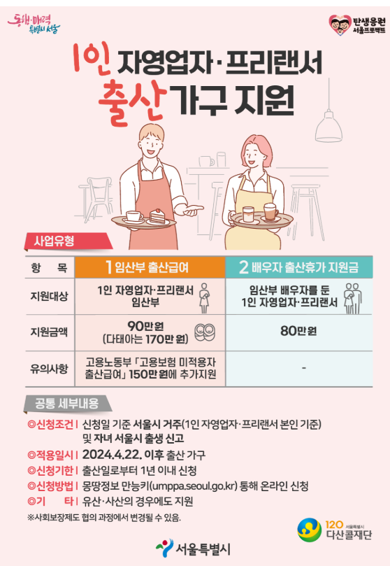 ✔️ 출산일 기준 서울시에 주민등록이 되어 있는 1인 자영업자, 프리랜서, 노무 제공자
