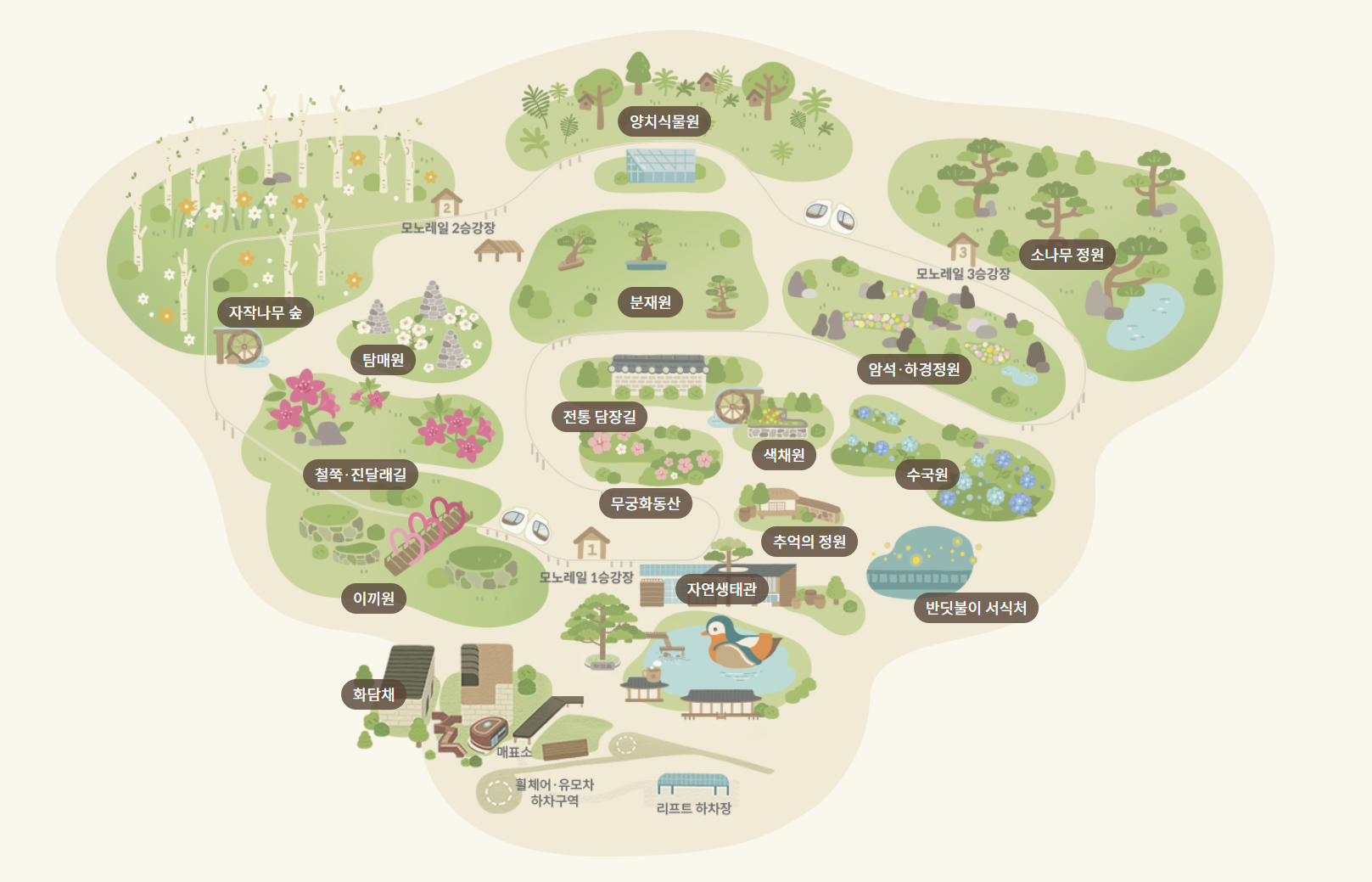- 화담숲의 주요 정원을 편하게 관람할 수 있는 코스로, 단풍원, 수국원, 이끼원 등을 한눈에 감상할 수 있습니다.