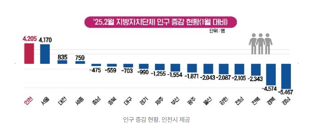 인천은 지난 1년간 서울과 6대 광역시 중에 유일하게 인구가 늘어난 도시 입니다. 인천은 작년 출생아 증가율에서도 1위를 차지했습니다.