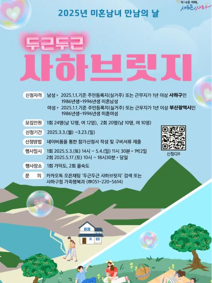 부산 사하구는 저출산 및 인구 유출 문제를 해결하기 위해 ‘두근두근 사하브릿지’라는 미혼남녀 만남 행사를 운영하고 있습니다. 결혼 성사를 통해 6,300만원을 받을 수 있는 참가 조건 확인 가능합니다.