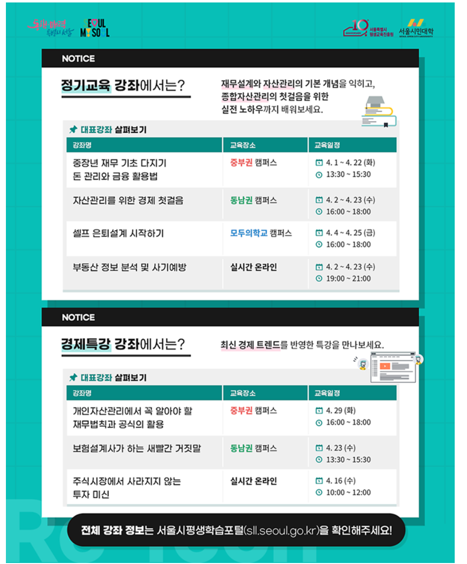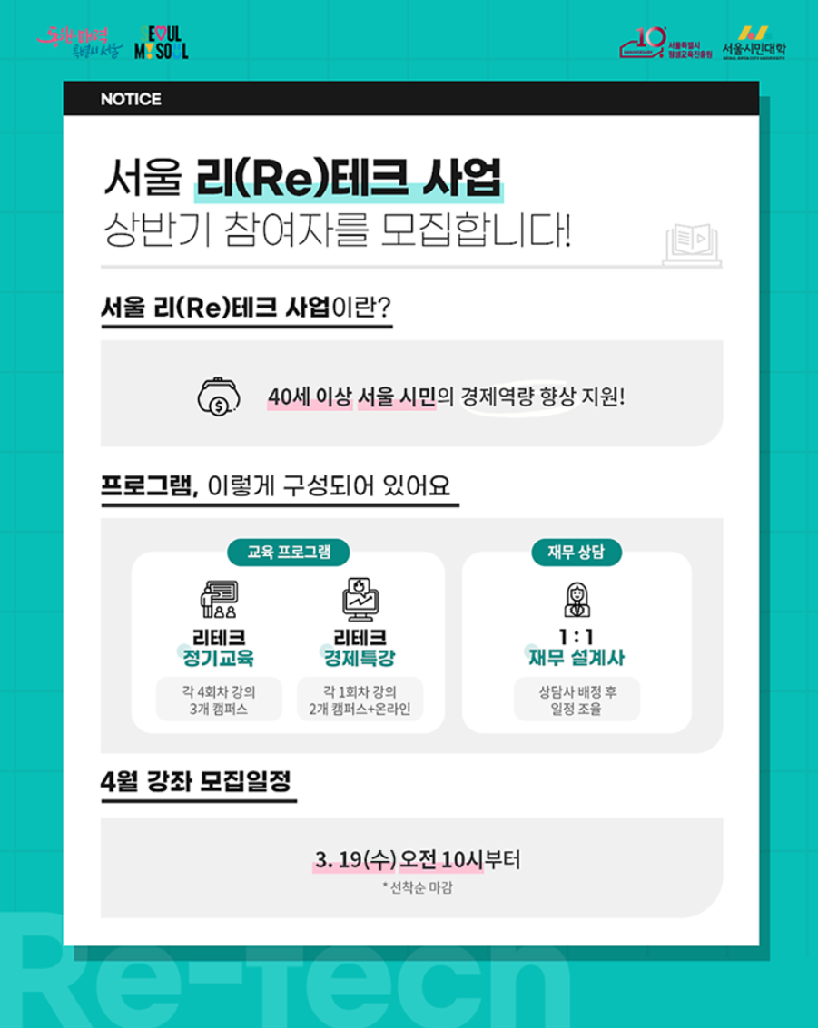 서울시가 중장년과 시니어를 위한 재무설계 및 경제교육 프로그램 ‘서울 리(Re)테크’를 4월 1일부터 운영합니다.