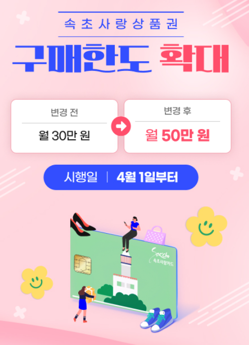 속초시가 4월 1일부터 속초사랑상품권의 월 구매 한도를 기존 30만 원에서 50만 원으로 상향합니다.