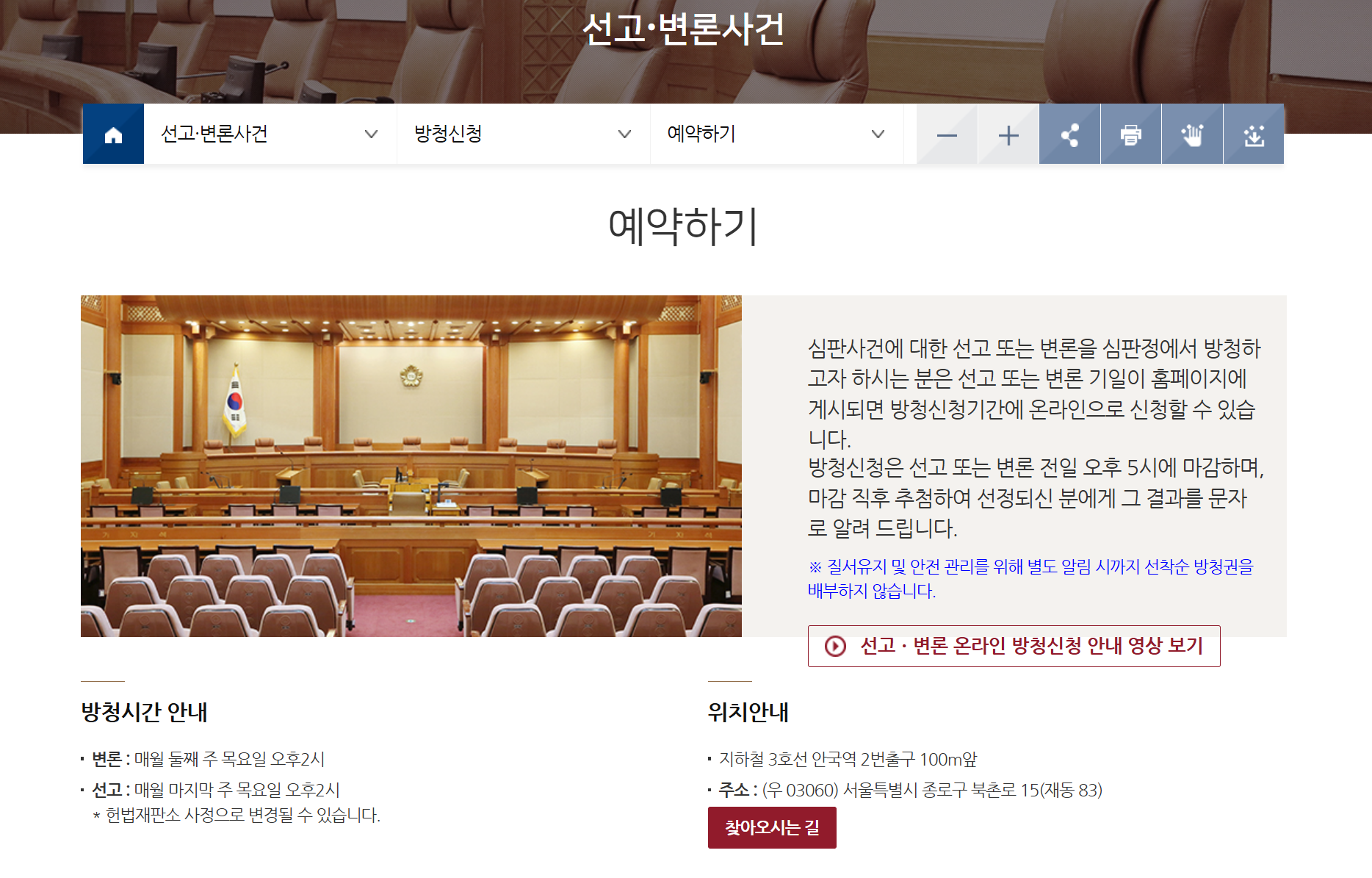 헌법재판소는 일정에 따라 변론과 선고를 진행하며, 일반인에게도 방청신청이 가능하다고 합니다. 다만 탄핵 선고 방청하려면 사전에 온라인 신청을 해야 합니다.