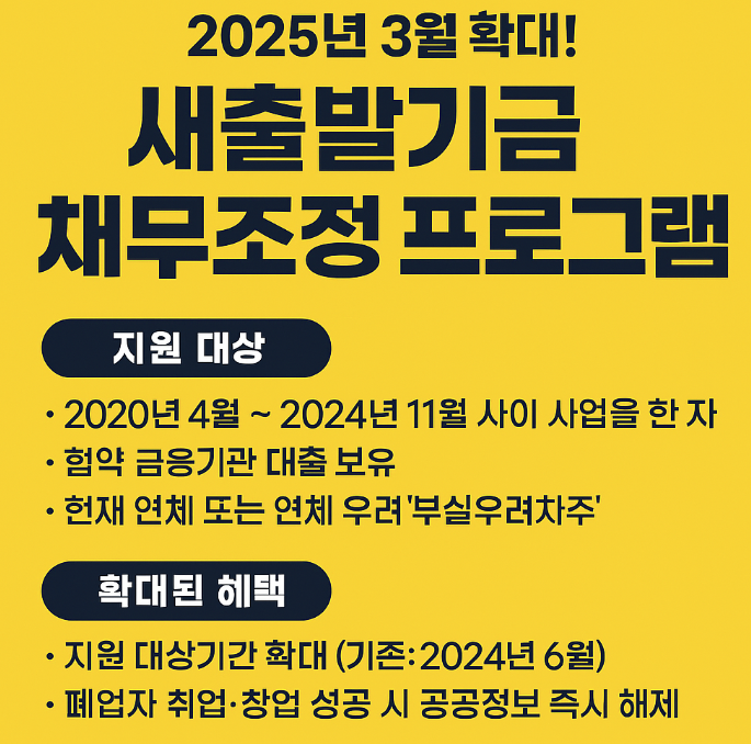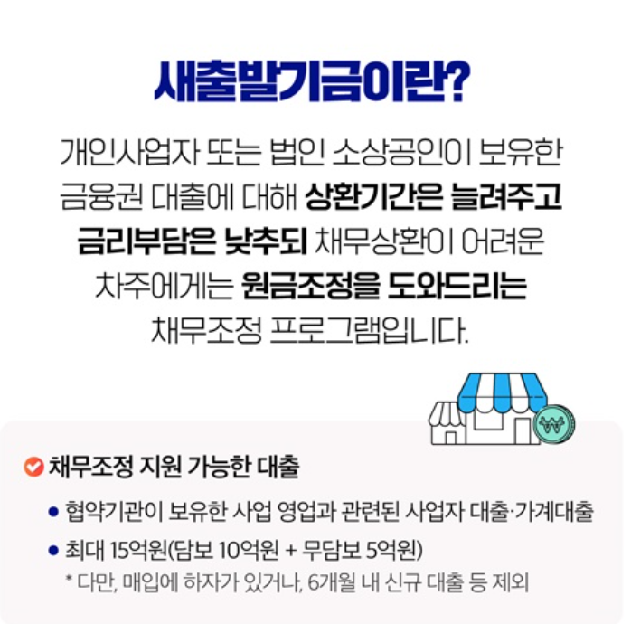 새출발기금’은 대출 상환에 어려움을 겪고 있는 소상공인·자영업자의 금융 부담을 완화하고 회복을 지원하기 위해 마련된 정부 주도의 채무조정 프로그램입니다.