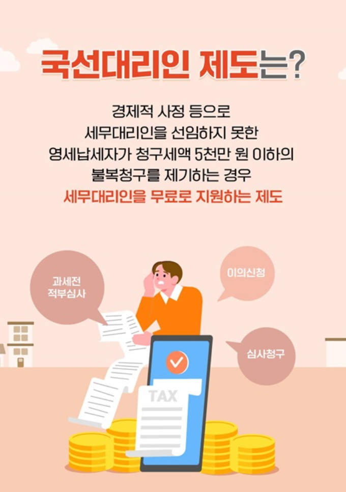 국선대리인 제도란, 경제적 사정 등으로 인해 세무대리인을 선임하지 못한 영세납세자가 청구세액 5천만 원 이하의 불복청구를 제기하는 경우, 국세청이 무료로 세무전문가(세무사, 변호사 등)를 지정해 세무 대리 업무를 지원하는 제도입니다.