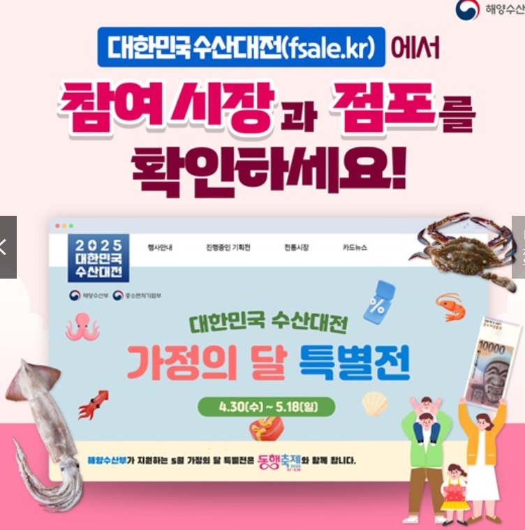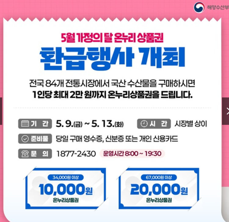 5월 가정의 달을 맞아, 전국 84개 전통시장에서 수산물을 구입하면 최대 2만원 온누리상품권으로 환급 받으실 수 있습니다.