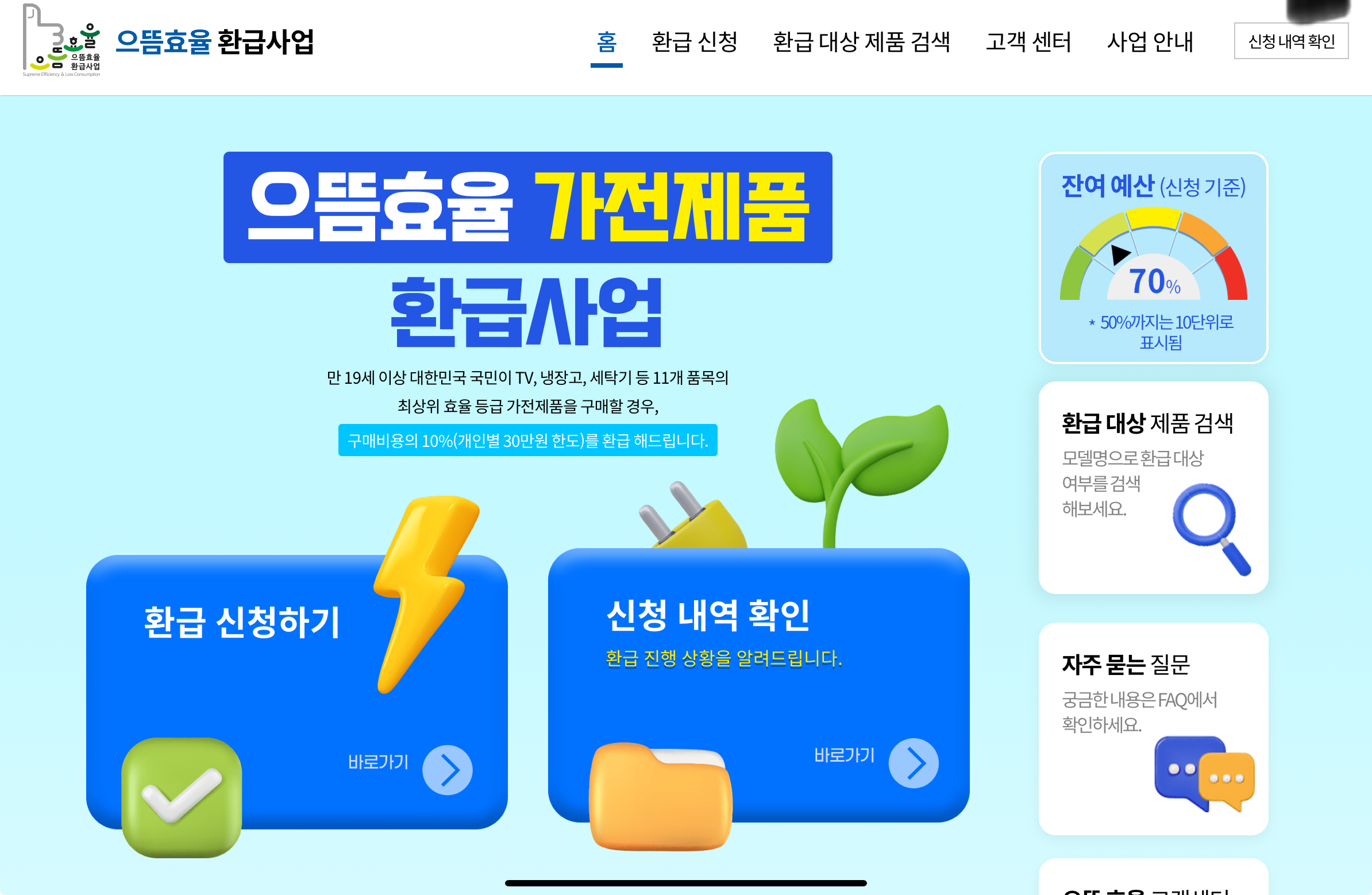 에너지 효율 1등급 가전제품을 구매하는 사람에게는 1인당 최대 30만원의 에너지효율 환급금을 지원하고 있습니다. 예산이 30%이상 소진되었으므로 빠르게 신청하셔야 합니다.