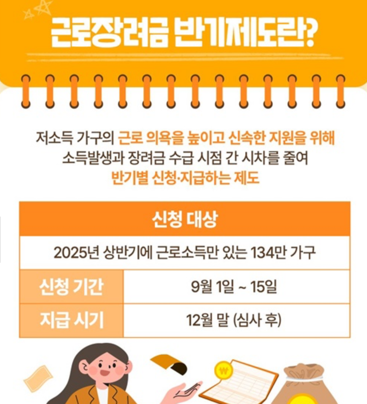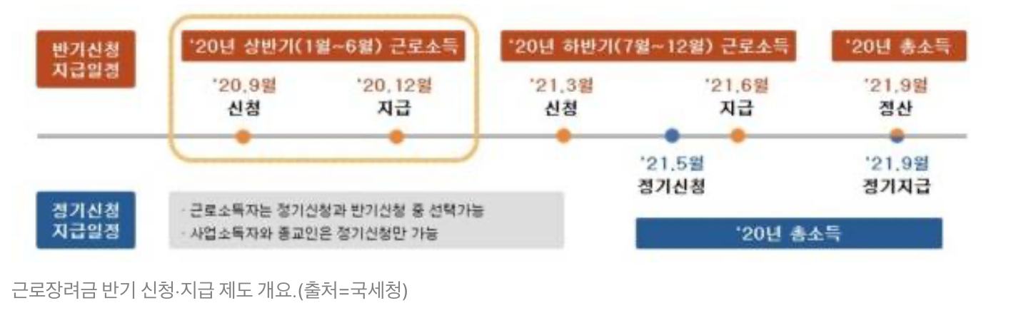 기존에는 1년에 한 번 정산 후 지급되었지만, 반기제도를 통해 소득 발생 시점과 지원 시점 간의 시차를 줄여 상·하반기별로 나누어 직급되며 기간 내 신청을 즉시 하셔야 합니다.