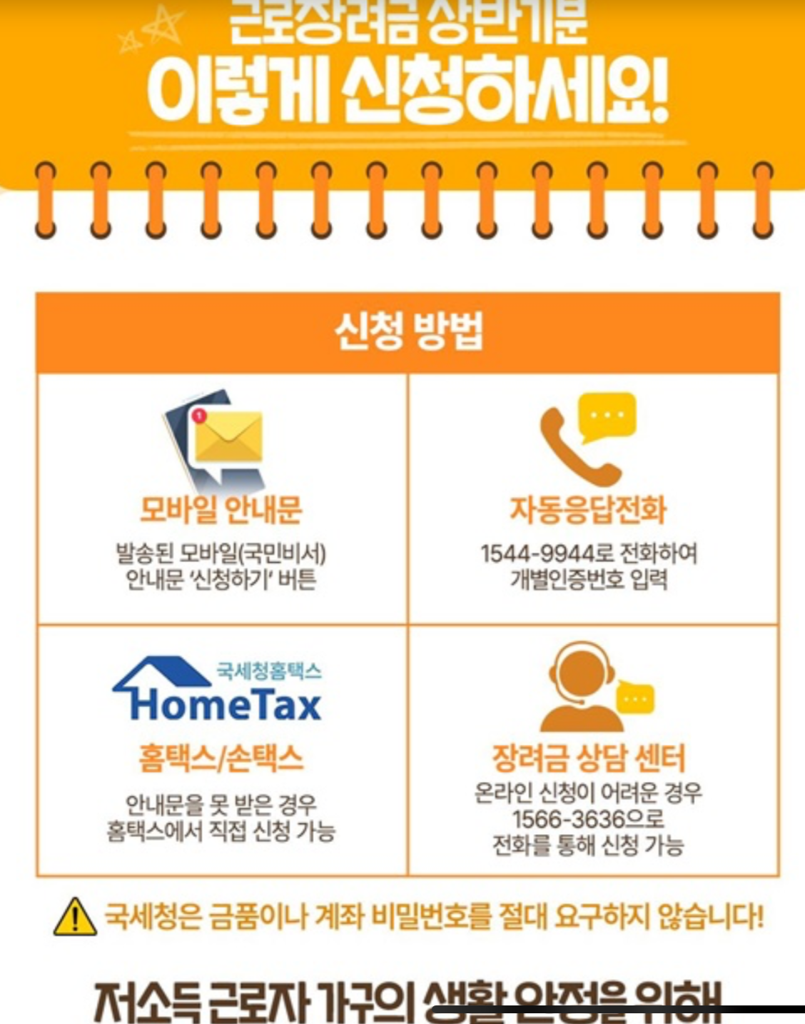 - 생활 안정 : 저소득 근로 가구가 생활비에 보탬을 받을 수 있습니다.