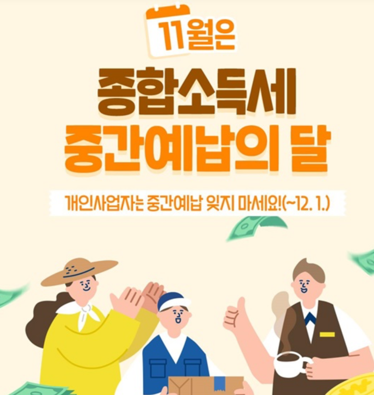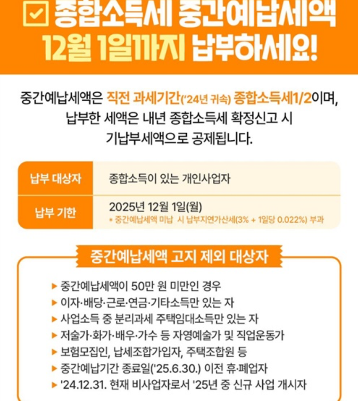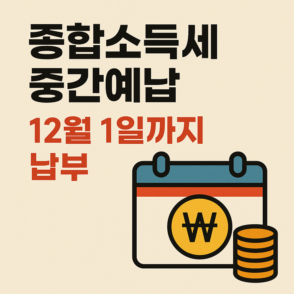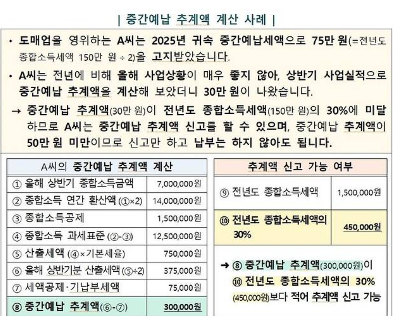 종합소득세 중간예납은 직전 과세기간(2024년 귀속) 종합소득세의 1/2 금액을 미리 납부하는 제도입니다.