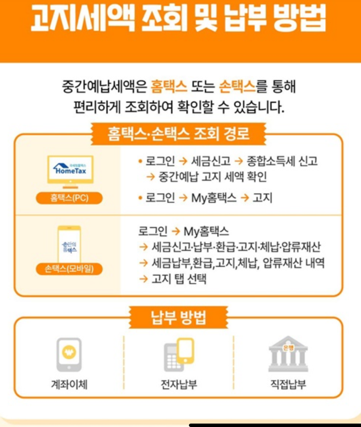 중간예납 고지세액은 종이 고지서를 받지 않아도 홈택스와 손택스를 통해 바로 조회할 수 있습니다.