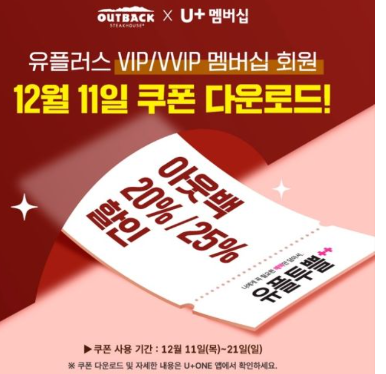 아웃백은 연말 시즌 동안 고객들의 외식 부담을 줄이기 위해 LG유플러스 멤버십 고객을 대상으로 특별 할인 이벤트를 진행합니다.