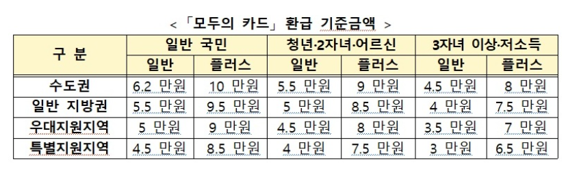 모두의 카드는 전국 어디서나 동일하게 적용되지만, 환급 기준금액은 지역과 이용자 유형에 따라 차등 설정됩니다.