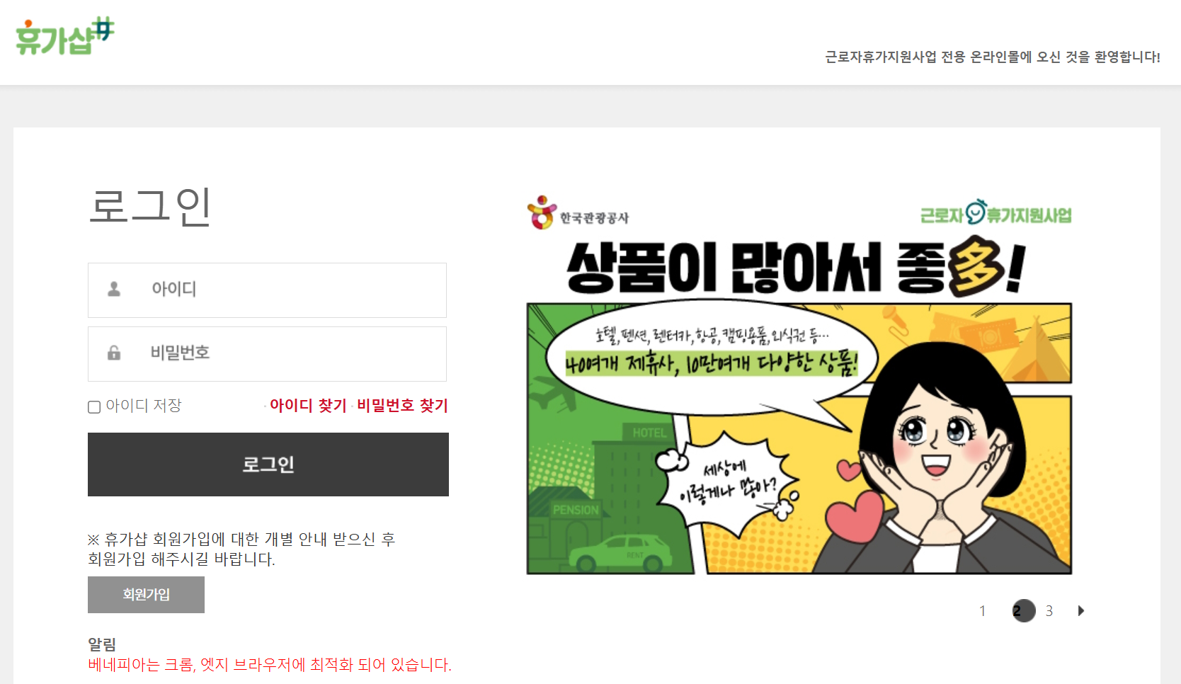 근로자 휴가지원 사업 전용 온라인몰로서 참여근로자들만을 위한 폐쇄몰입니다.