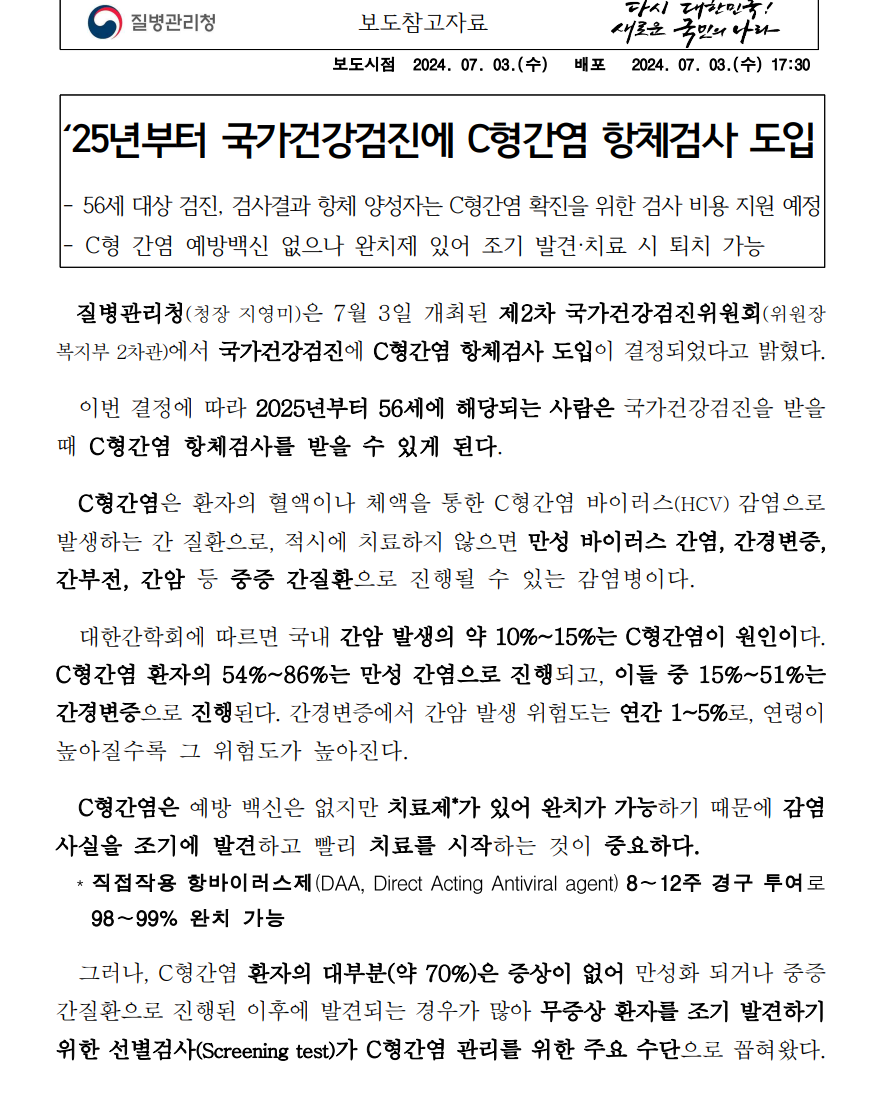 2025년부터 국가건강검진에 C형 감염됩니다. 구체적인 검사 지원 내용은 아래와 같이 시행합니다.