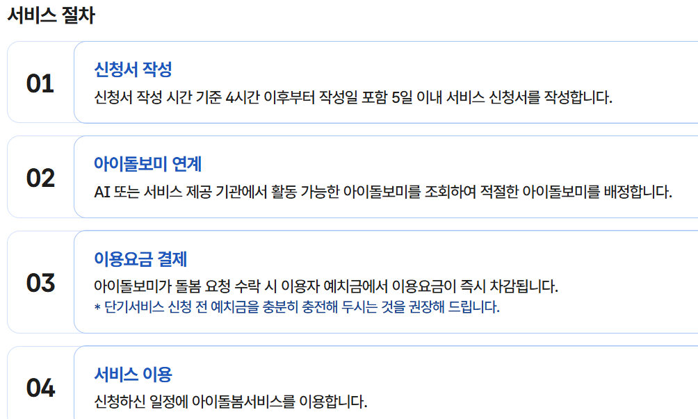 아이돌보미가 수락한 단기서비스 신청서는 이용 시간 수정이 불가하며, 서비스 시작 시간 기준 72시간 이내 취소 요청한 경우 동일한 날짜의 신청서 작성이 불가합니다.* 단, 서비스 제공 기관에서 취소 처리한 경우에는 신청 가능합니다.