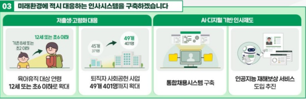 - 공무원 처우 개선 및 우수 인재 육성을 통해 국민 신뢰 회복과 행정서비스 품질 향상을 추구.