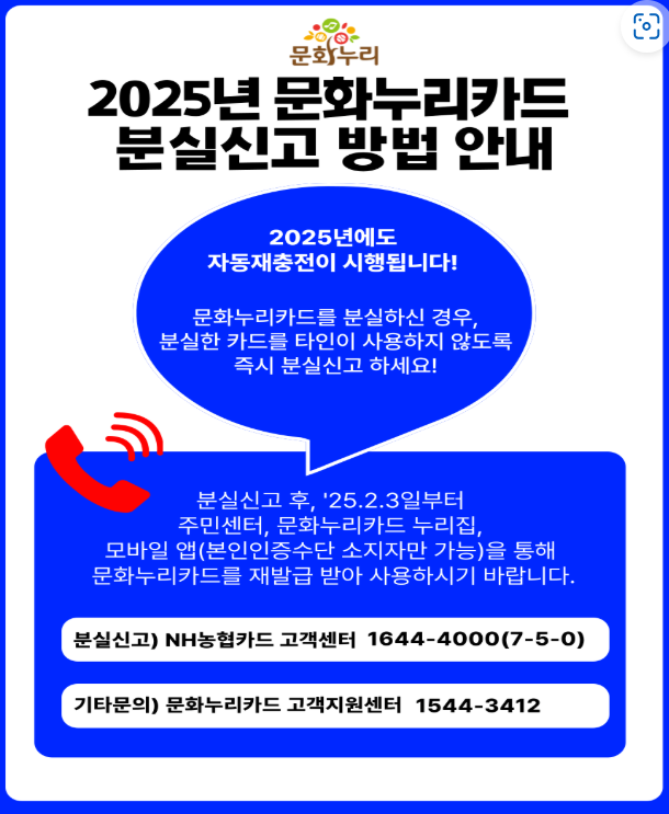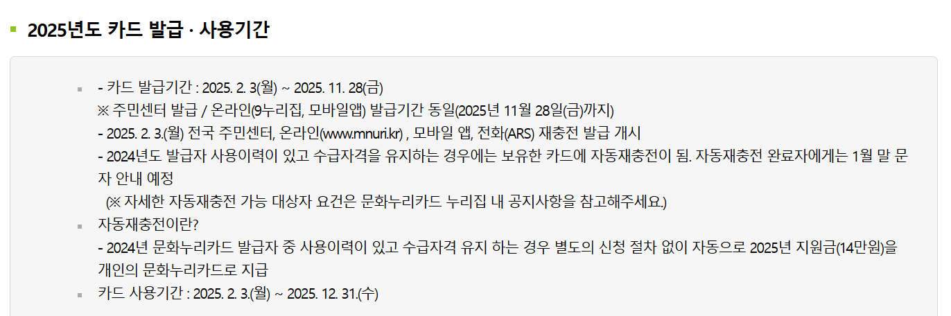 자동재충전이란?2024년 문화누리카드 발급자 중 사용이력이 있고 수급자격 유지 하는 경우 별도의 신청 절차 없이 자동으로 2025년 지원금(14만원)을 개인의 문화누리카드로 지급
