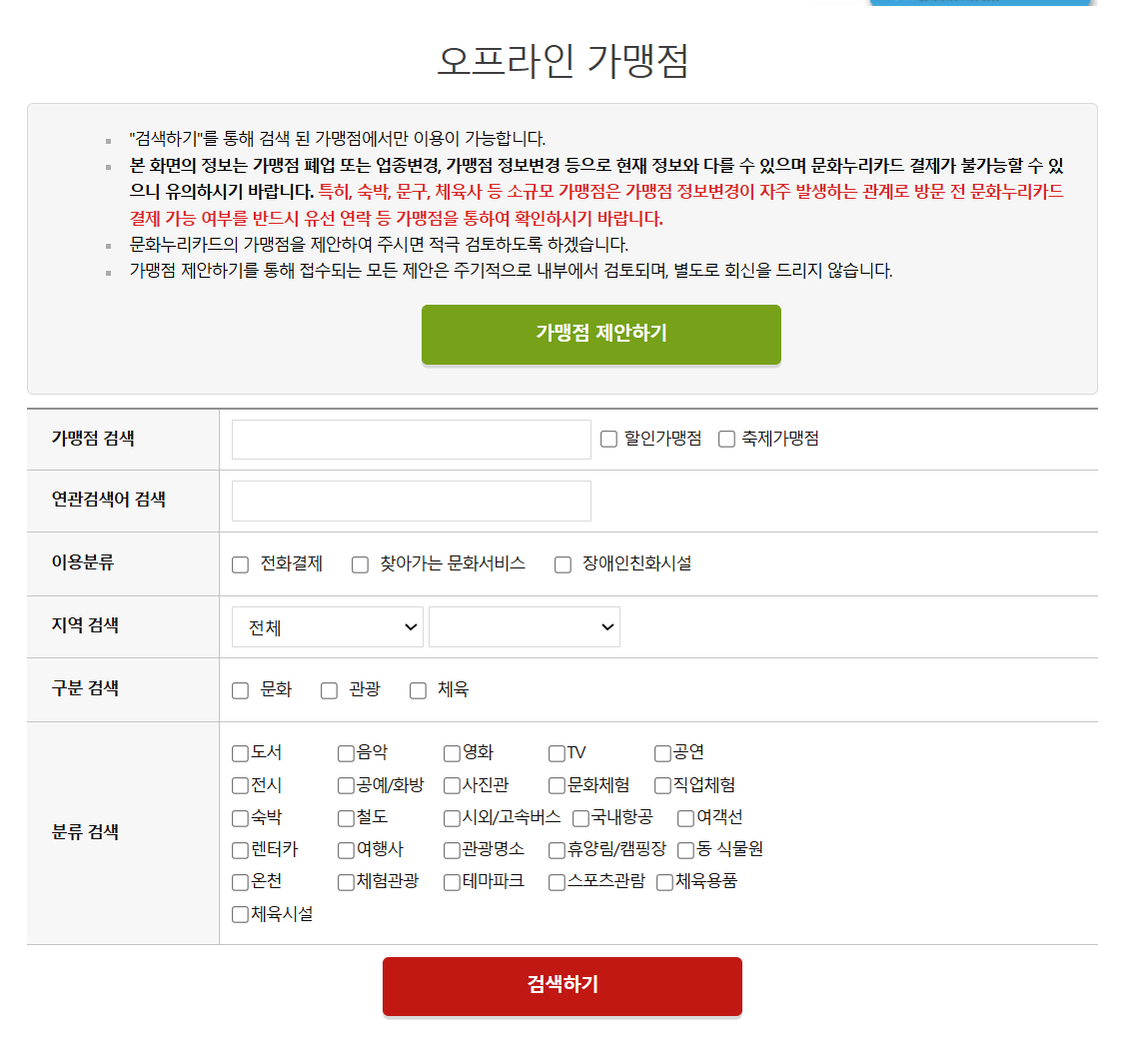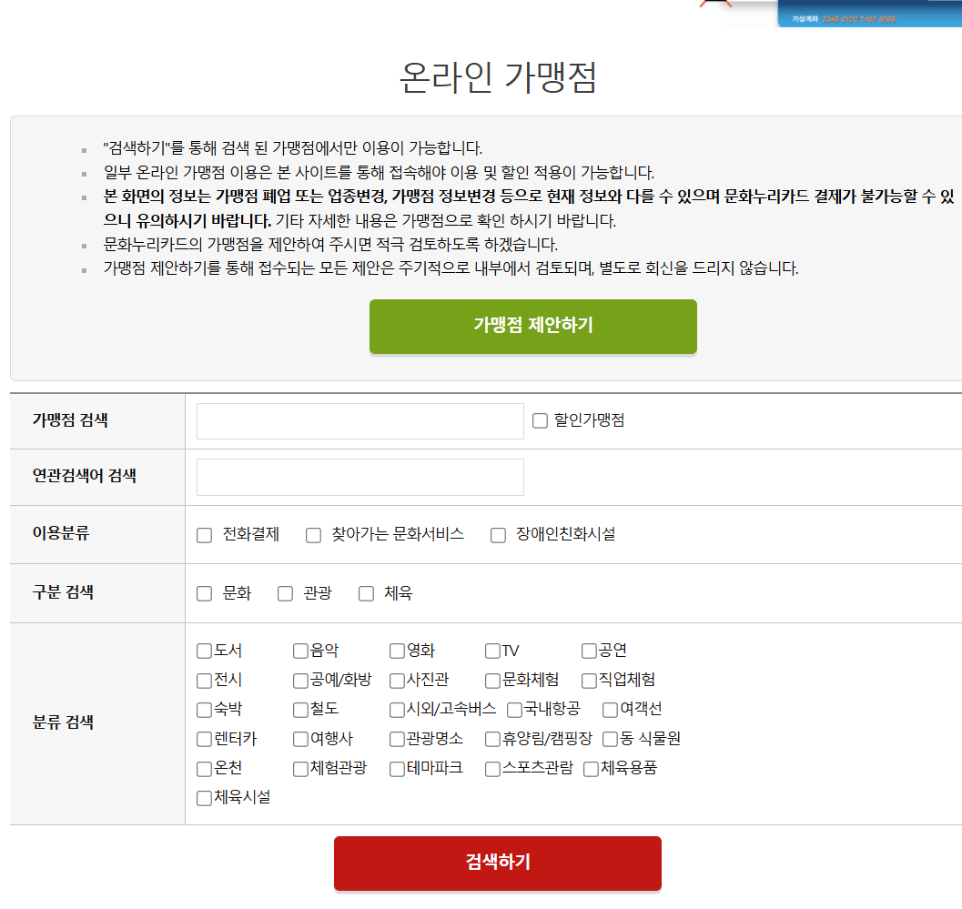 문화누리카드는 반드시 등록된 가맹점에서 결제가 가능합니다.