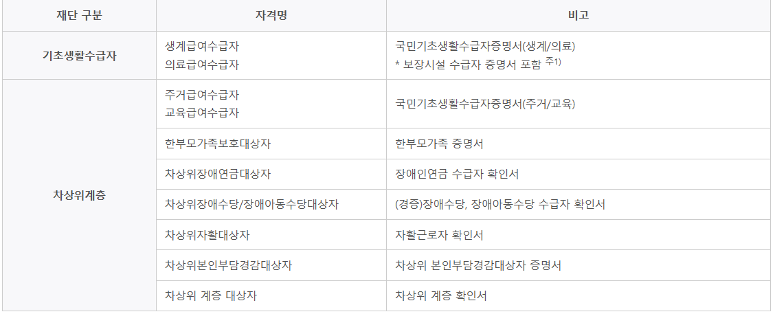인정 범위 : 학생 및 가구원(부모) 중 1인 이상이 학자금 신청일 기준 또는 소득‧재산 조사 개시일 전에 아래 자격을 유지하고 있는 경우 복지자격(기초생활수급자* 또는 차상위계층)으로 판정