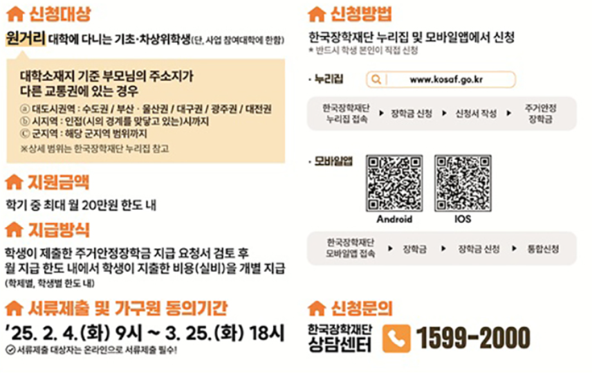 이는 원거리 대학 진학으로 주거 관련 비용 부담이 저소득 대학생들에게 경제적 부담을 완화하기 위해 올해부터 주거안정장학금 제도를 새롭게 도입된 제도입니다.
