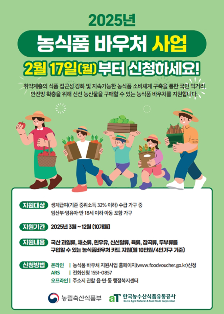 2025년 2월 17일부터 정부는 사회적 취업계층을 위해 먹거리 안정망의 일환으로 농식품 바우처를 지원합니다.
