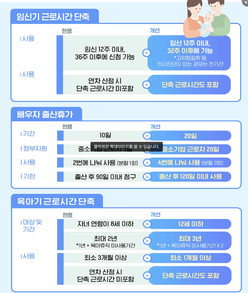 임신기 근로시간 단축 기간도 기존 임신 12주 이내, 36주 이후에서 임신 12주 이내, 32주 이후로 확대됩니다.