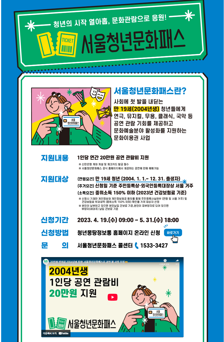 서울시는 2025년에도 ‘서울청년문화패스’ 사업을 이어가며 20~23세 청년들에게 연 20만원의 문화관람비를 지원한다고 발표했습니다.