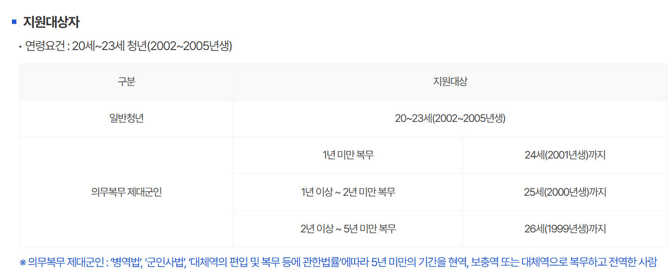 올해부터는 군 복무를 마친 청년들에게 복무 기간만큼 연령을 가산하는 제도를 도입하여, 지원 대상이 최대 1999년생까지 확대되었습니다.