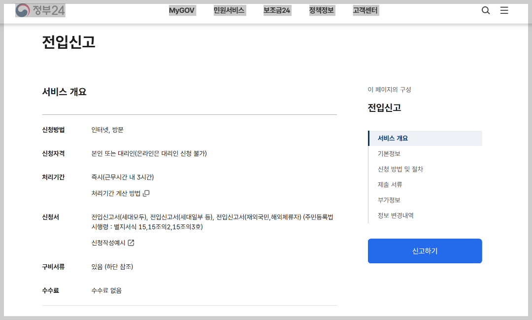 지금 바로 정부 24를 통해서 전입신고하기가 가능합니다.