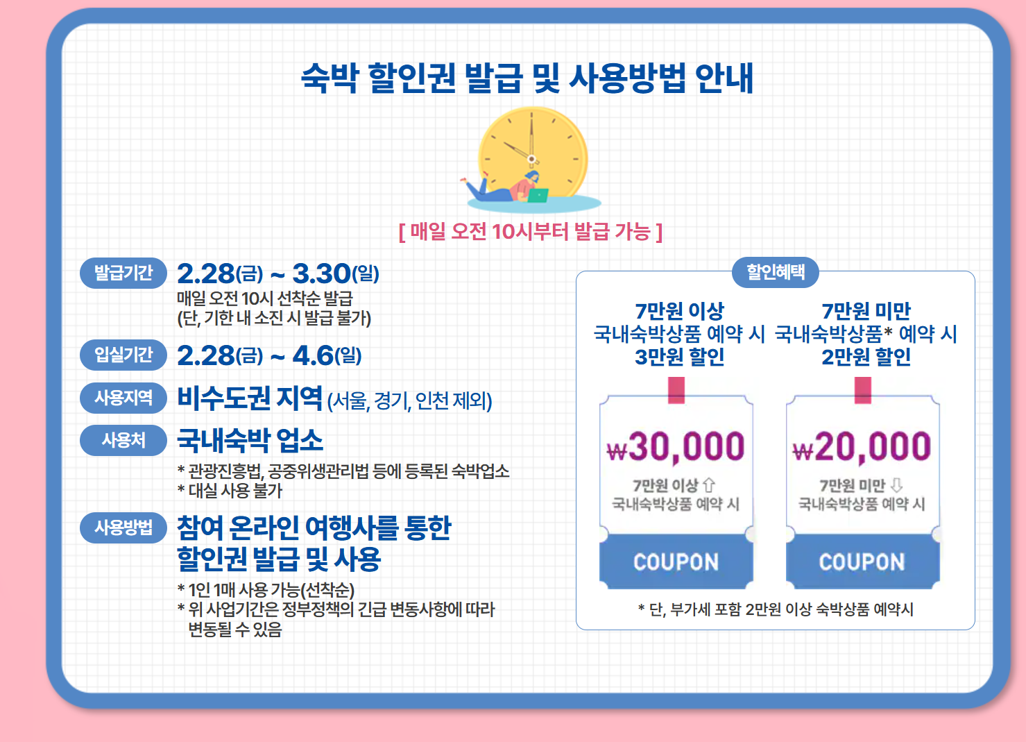 - 2월 28일 오전 10시 이후, 숙박세일 페스타 공식 누리집(홈페이지) 및 참여 온라인 여행사에서 할인권 신청