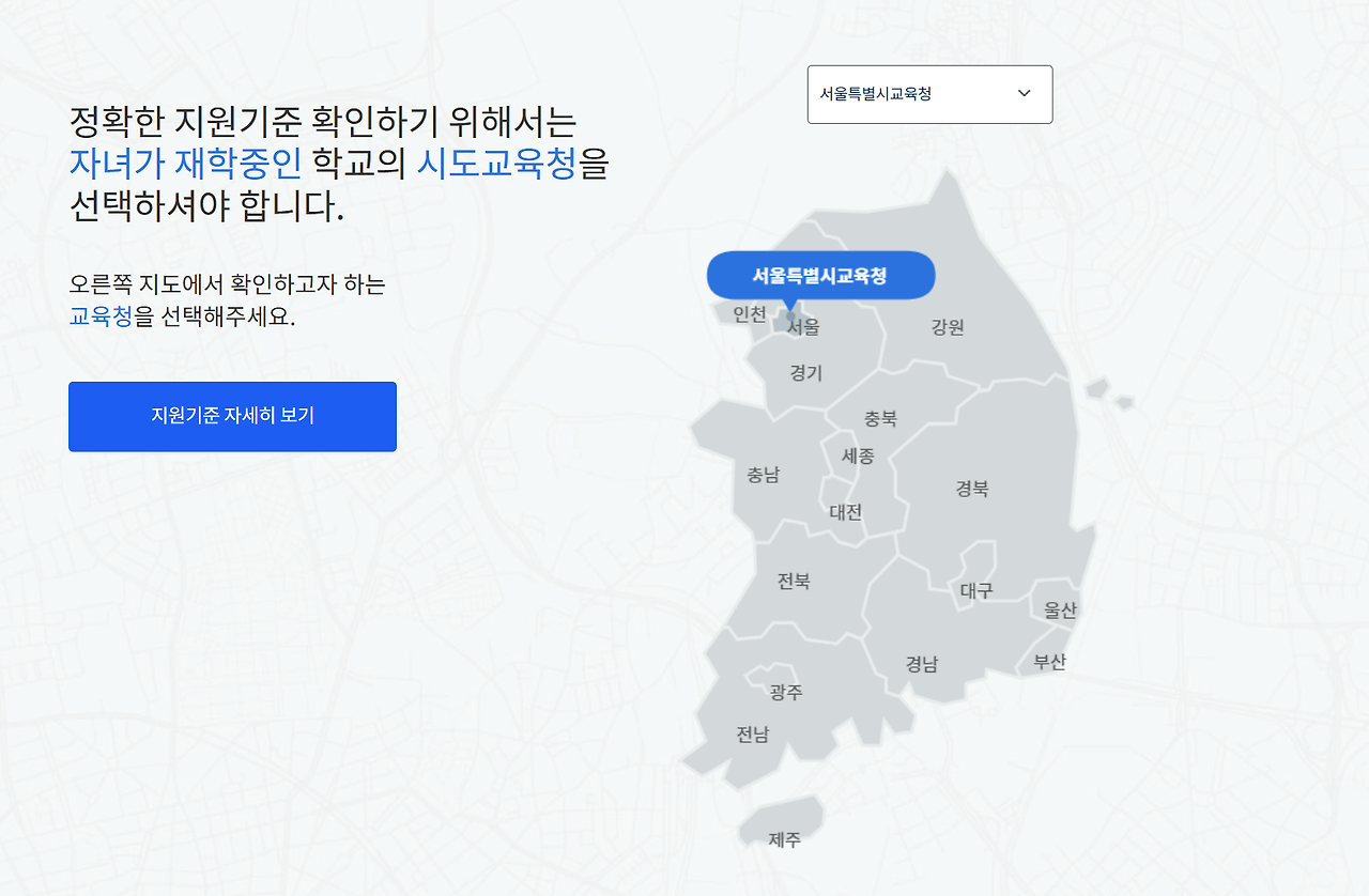 서비스를 이용하기 위해서는 현재 학생이 다니고 있는 지역을 선택해야 합니다. 학년별 지원 금액은 동일하지만